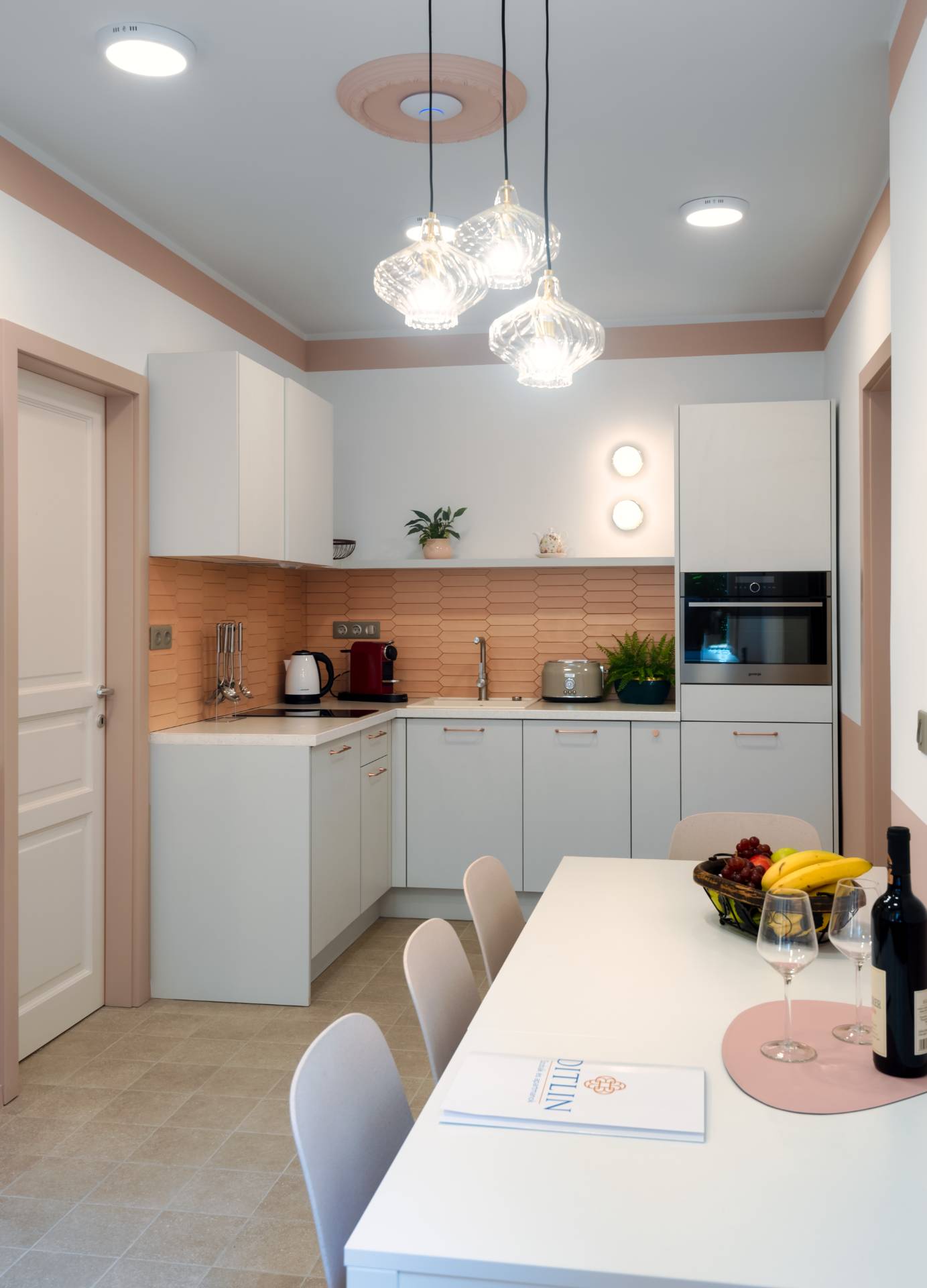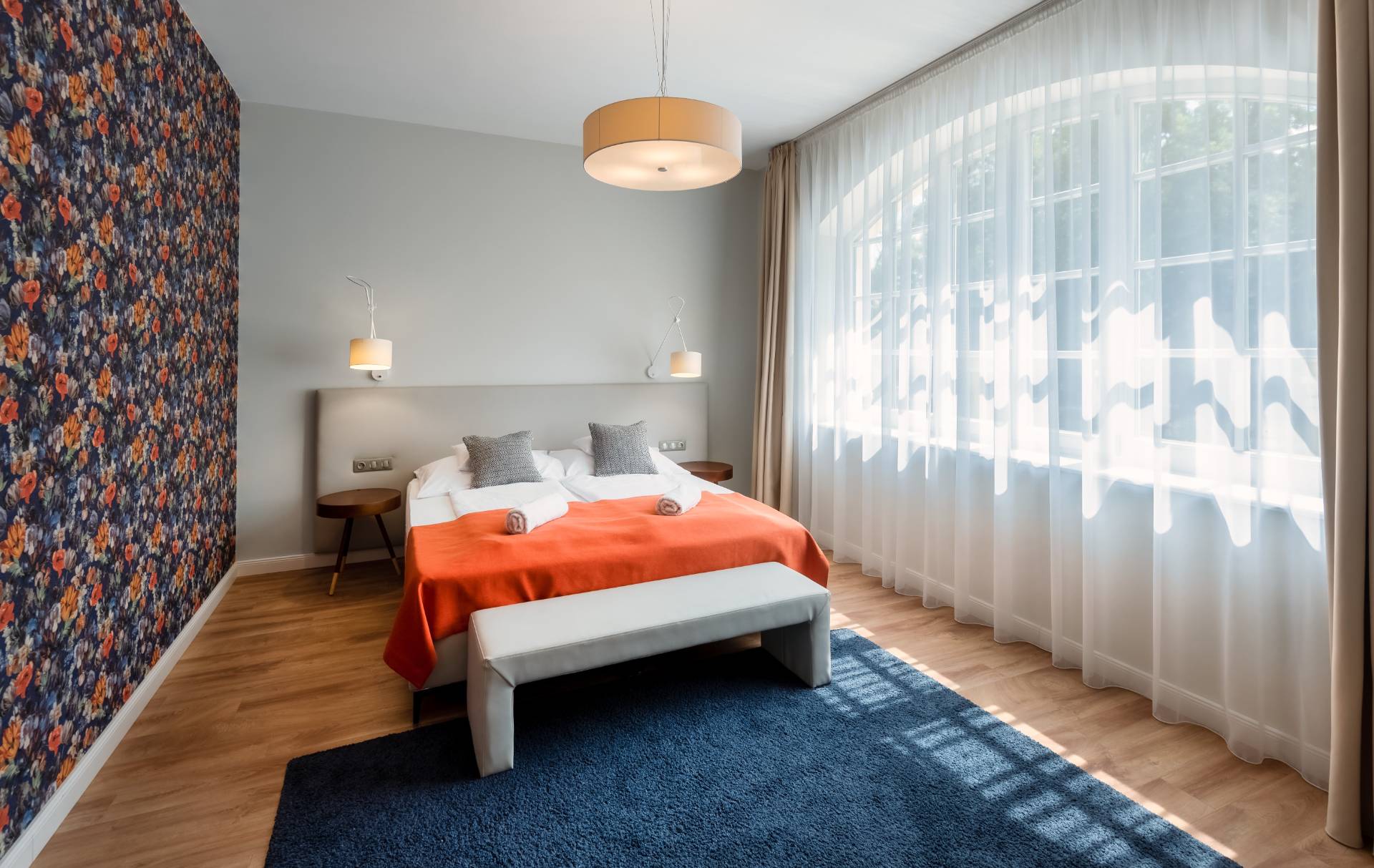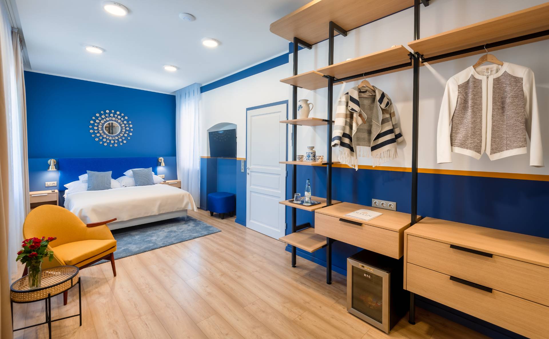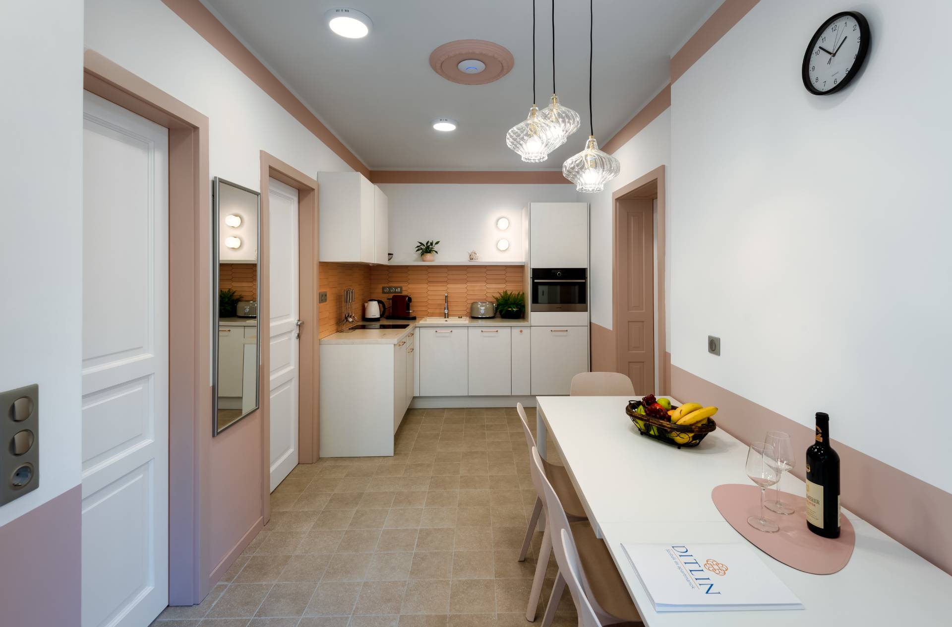 Kiemelt figyelmet kaptak a praktikus tárolórendszerek, tv-falak és a beépített konyhai megoldások, amelyek harmonizálnak a hotel egyedi színvilágával. A fürdőszobai lebegő mosdópultok és a precíz részletmegoldások garantálják a vendégek számára a prémium komfortélményt.
