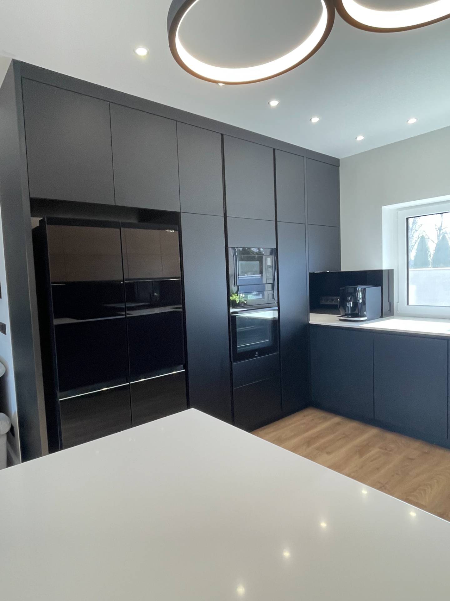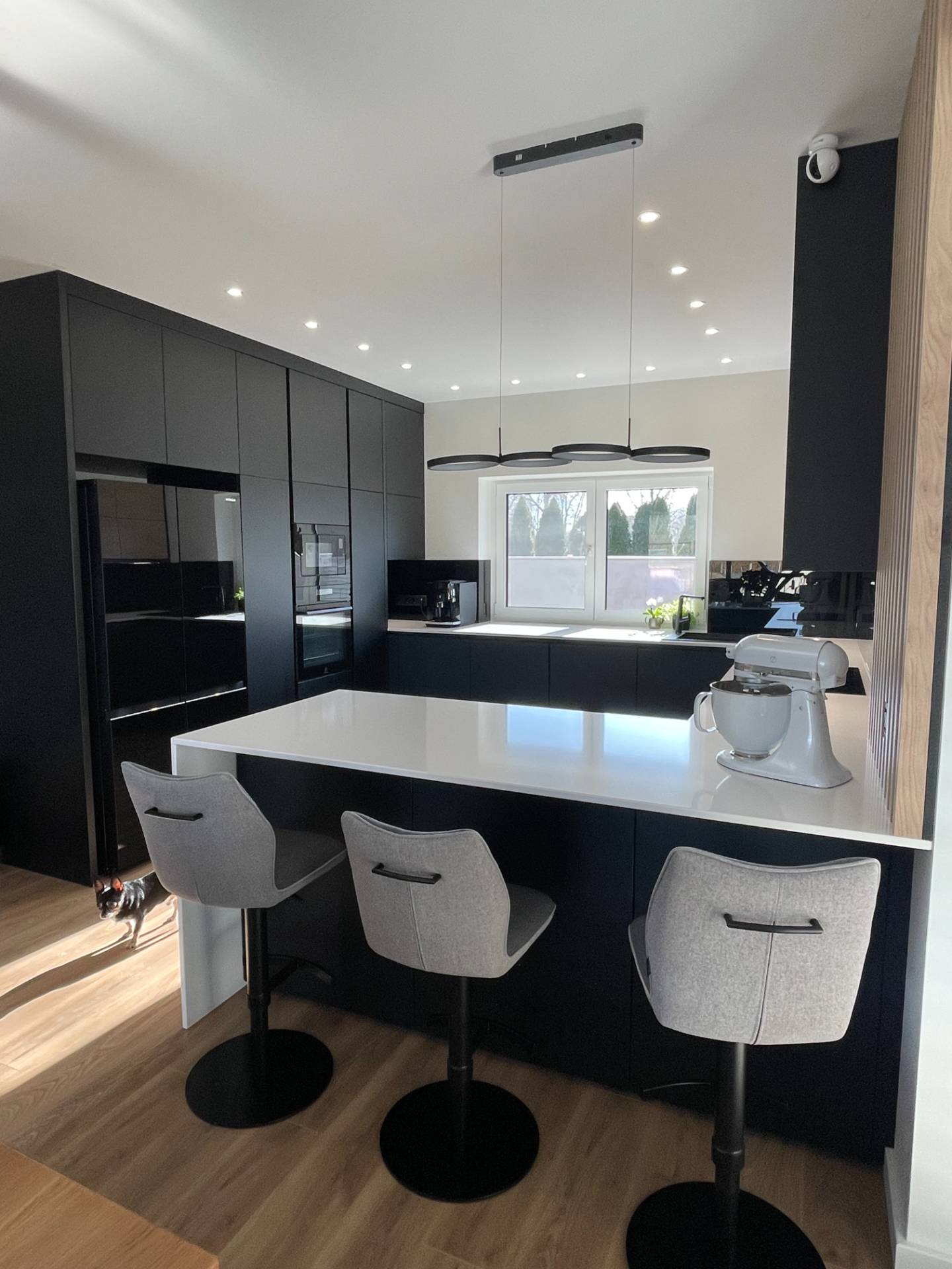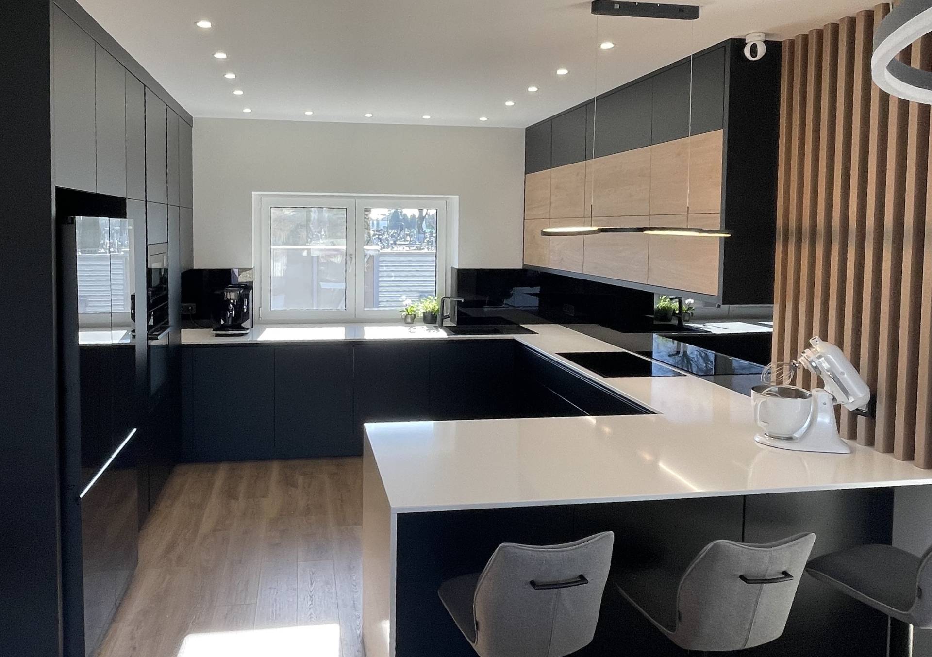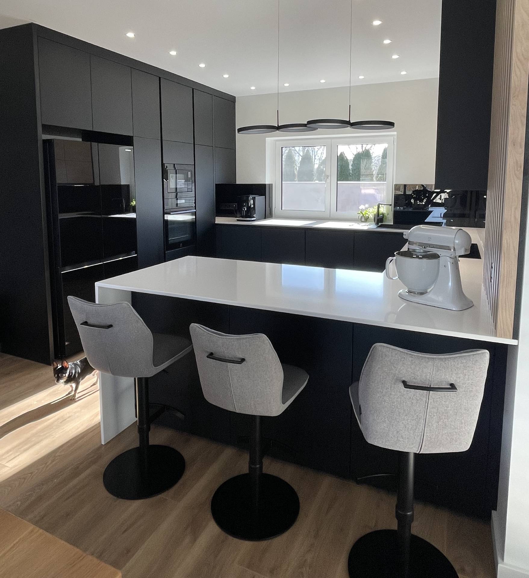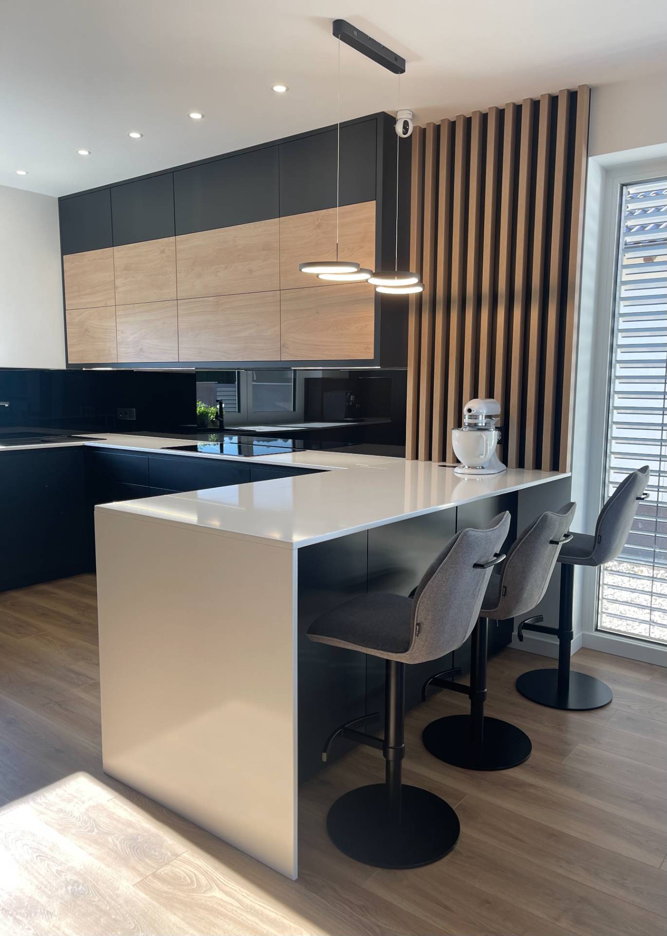 A modern minimál stílus jegyében készült projektünkben a matt fekete frontok és a sötét kőhatású munkalapok dominálnak. A SIHO Design által tervezett konyhabútor különlegessége a mennyezetig érő beépítés és a konyhaszigetbe integrált étkezőpult. Precíz asztalosmunka, ahol a sötét tónusok luxus életérzést és letisztult harmóniát teremtenek.