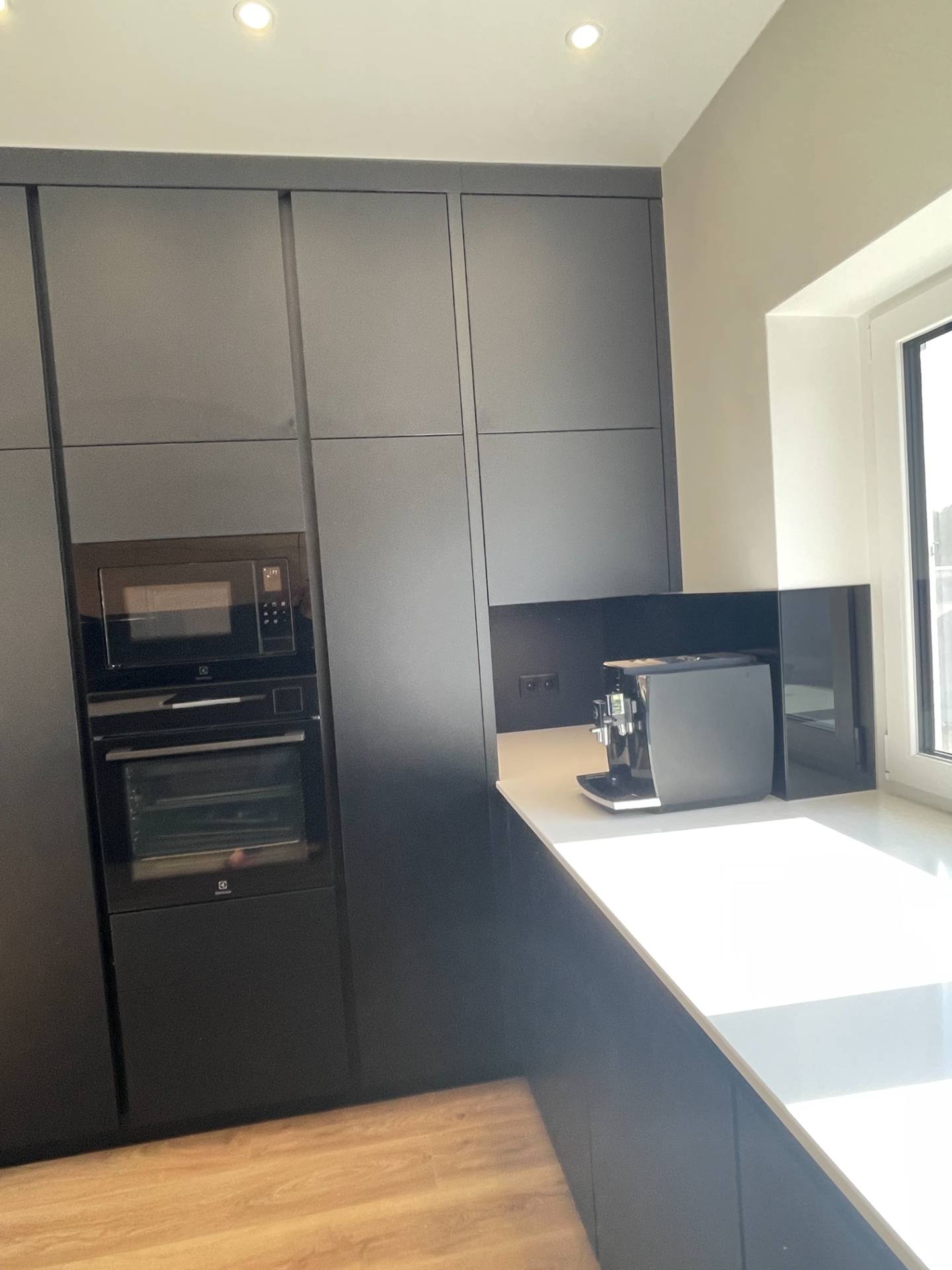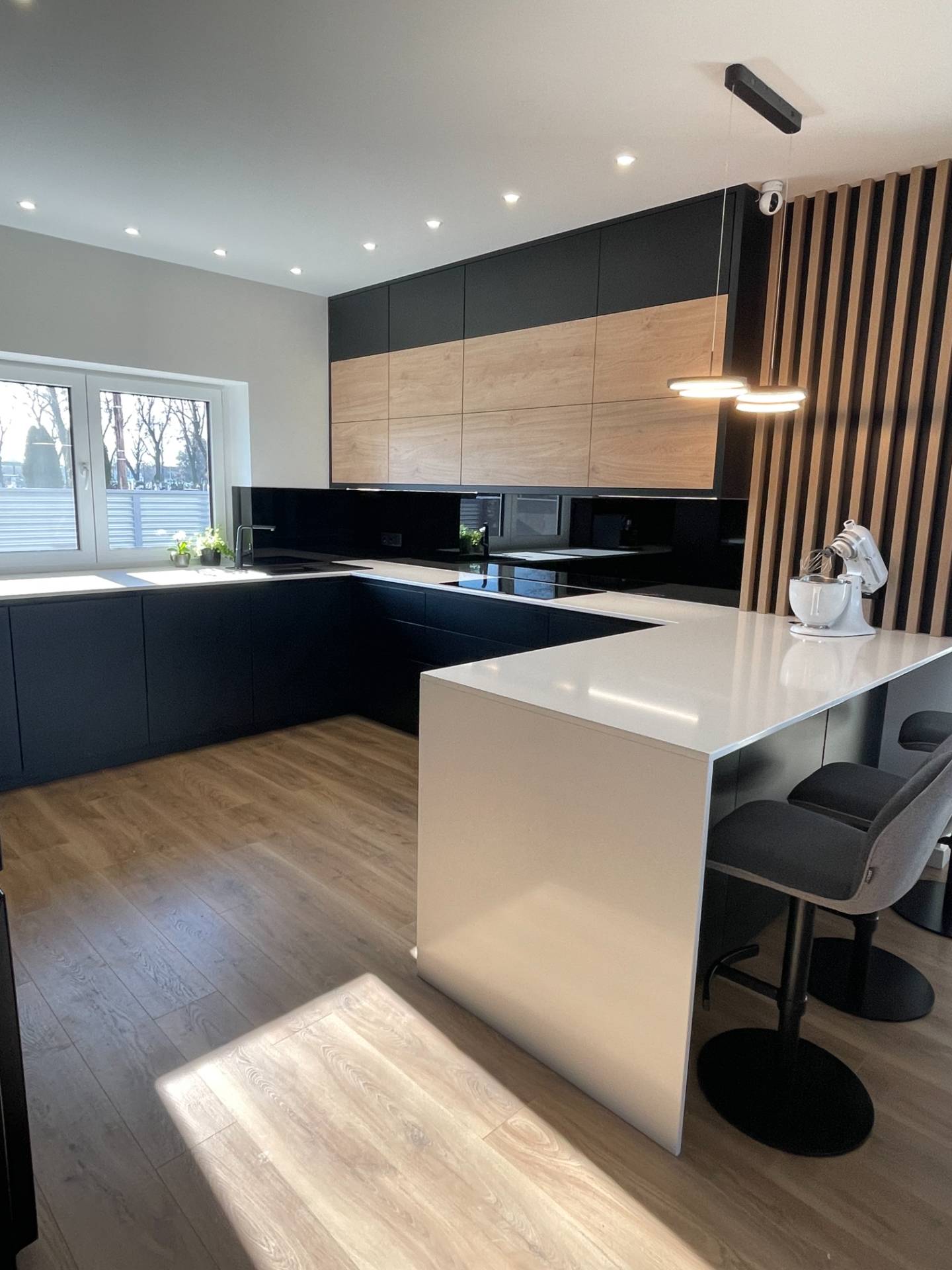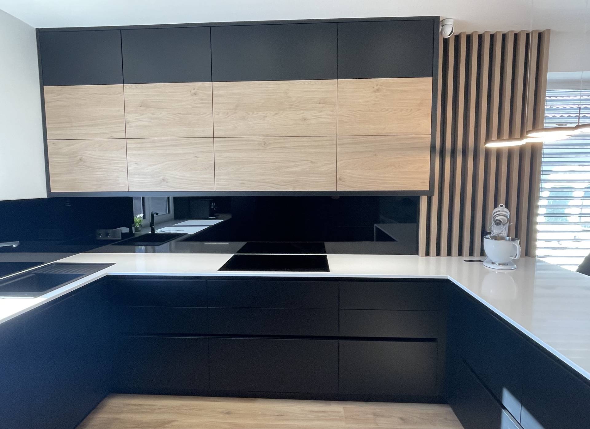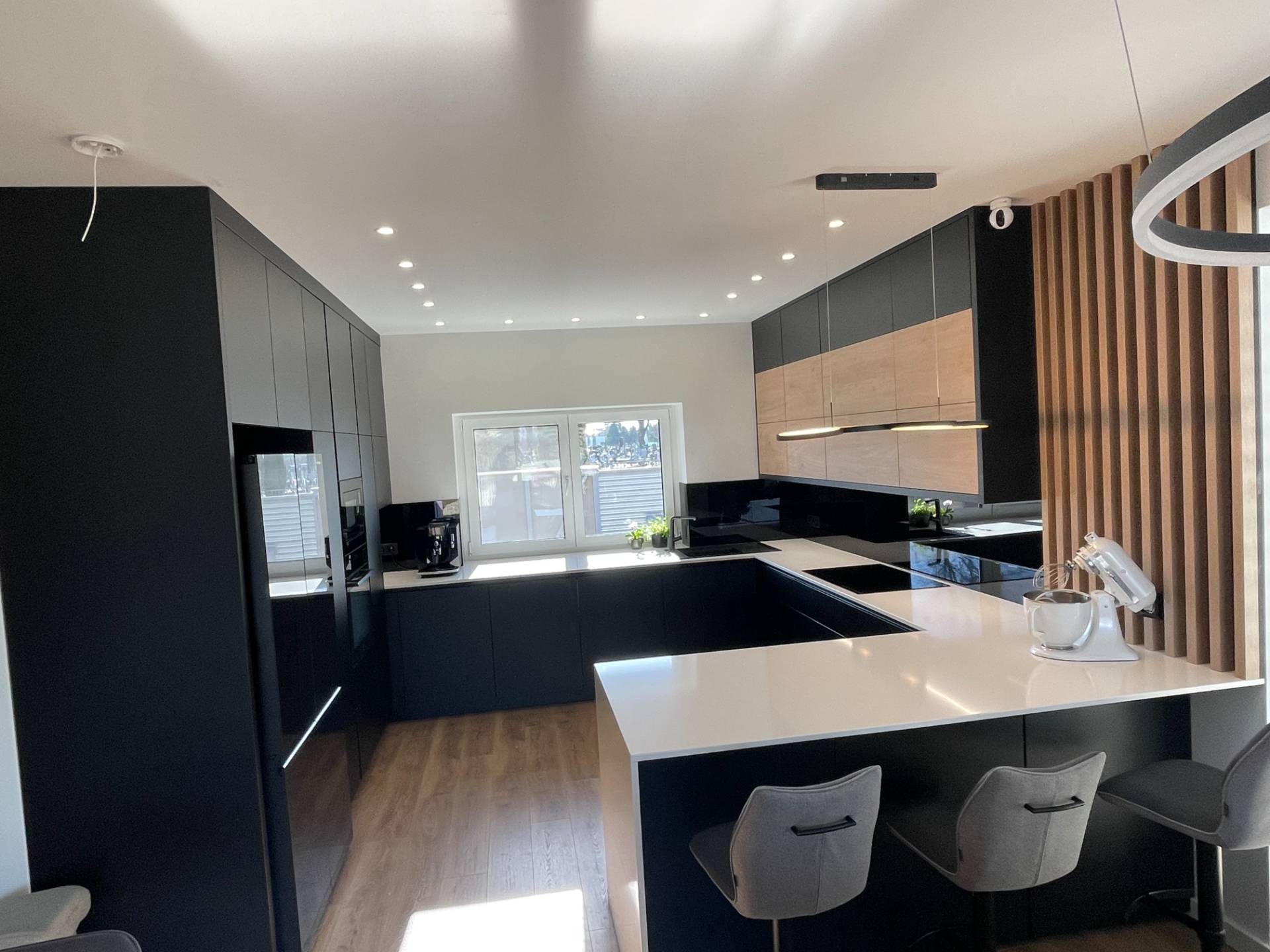 A modern minimál stílus jegyében készült projektünkben a matt fekete frontok és a sötét kőhatású munkalapok dominálnak. A SIHO Design által tervezett konyhabútor különlegessége a mennyezetig érő beépítés és a konyhaszigetbe integrált étkezőpult. Precíz asztalosmunka, ahol a sötét tónusok luxus életérzést és letisztult harmóniát teremtenek.