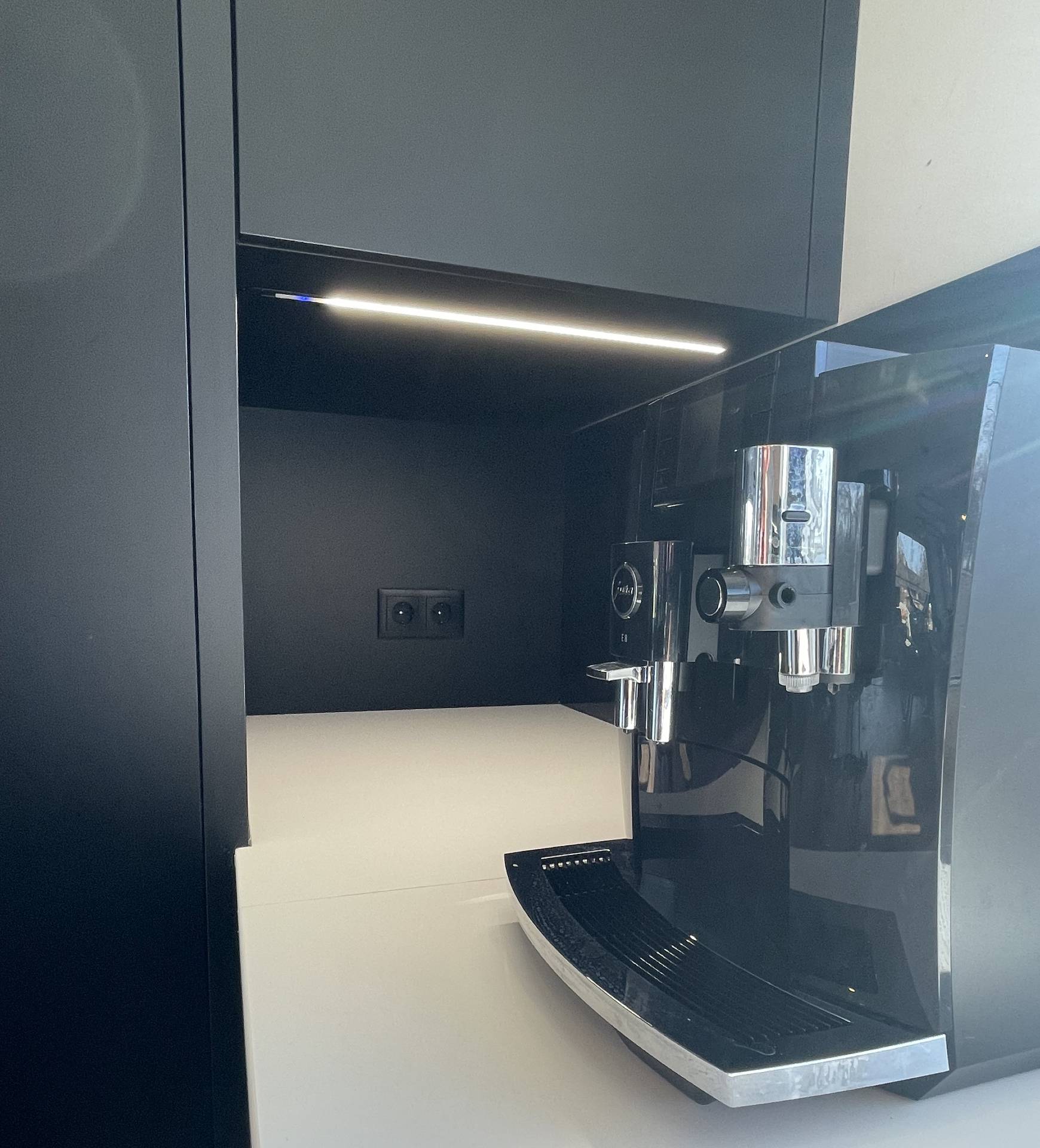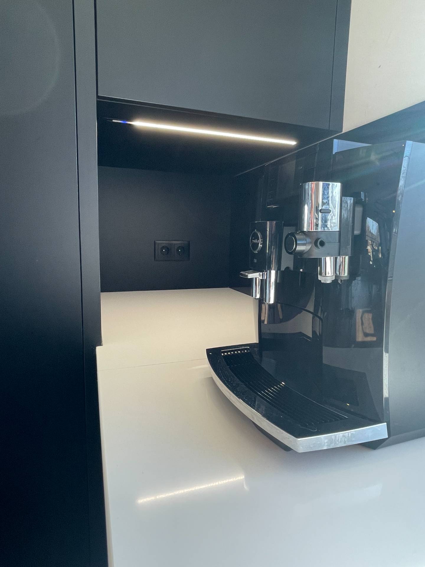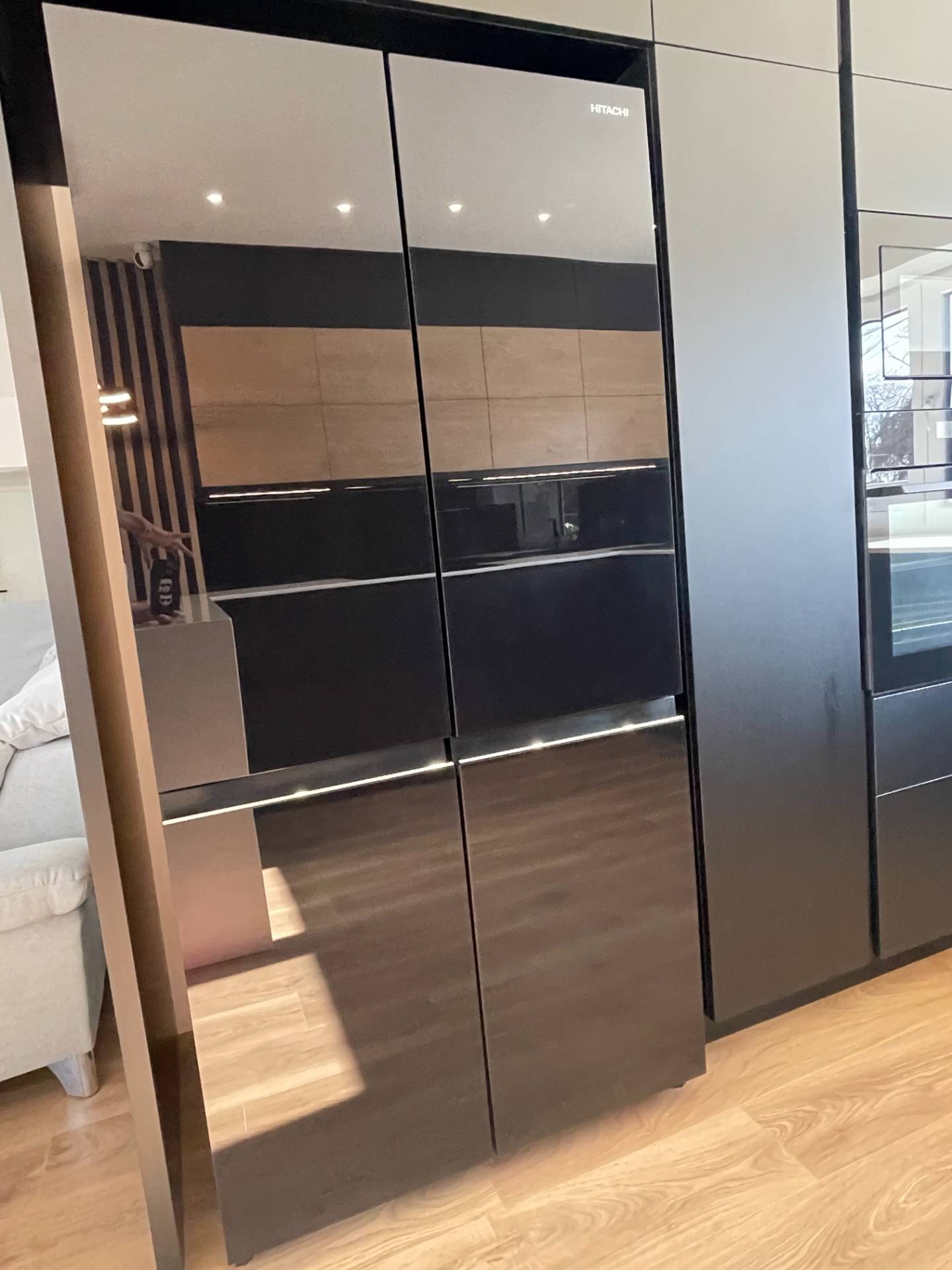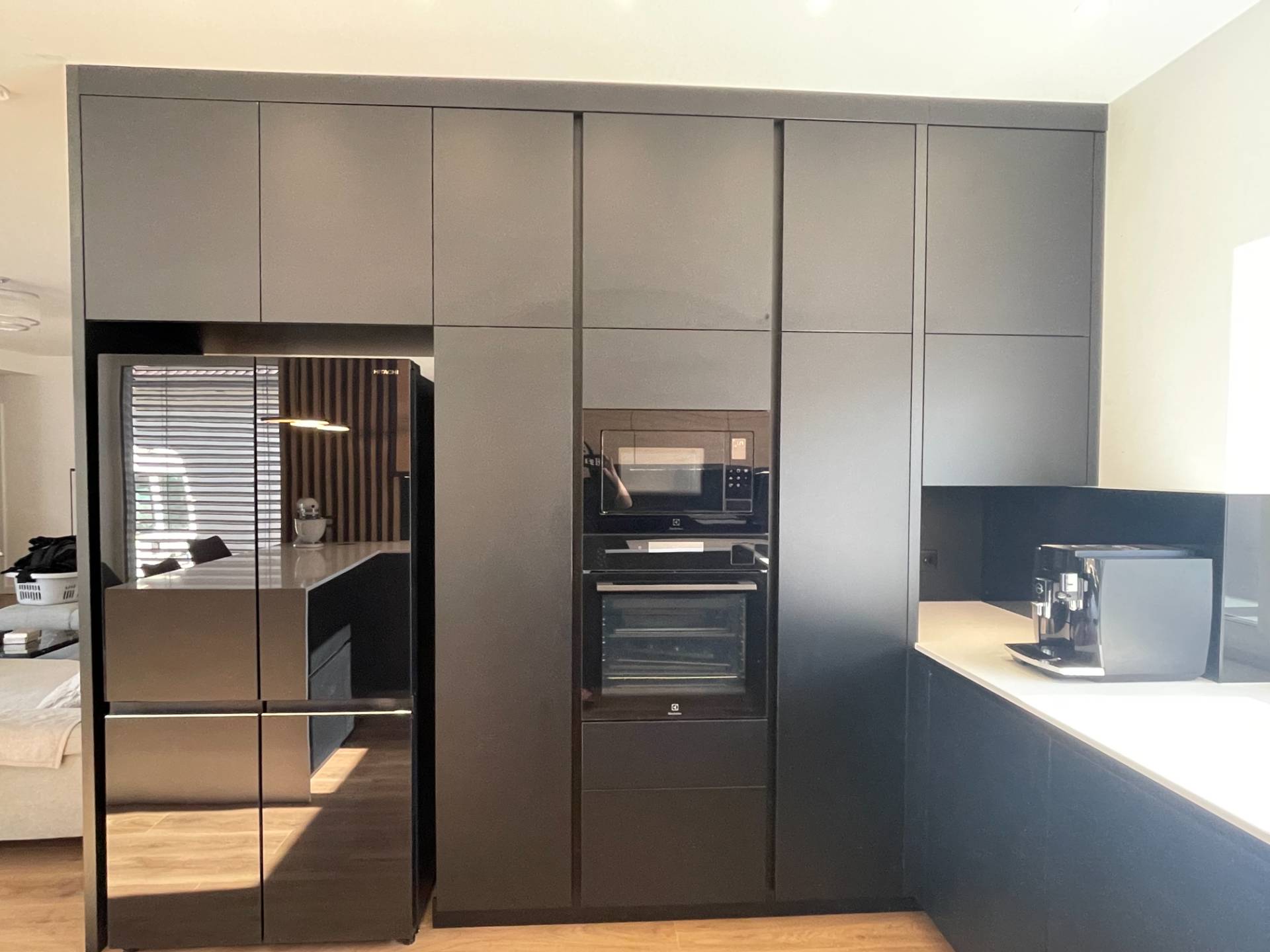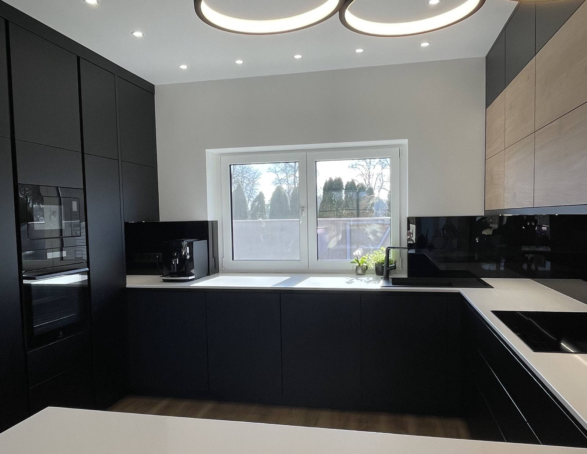 A modern minimál stílus jegyében készült projektünkben a matt fekete frontok és a sötét kőhatású munkalapok dominálnak. A SIHO Design által tervezett konyhabútor különlegessége a mennyezetig érő beépítés és a konyhaszigetbe integrált étkezőpult. Precíz asztalosmunka, ahol a sötét tónusok luxus életérzést és letisztult harmóniát teremtenek.