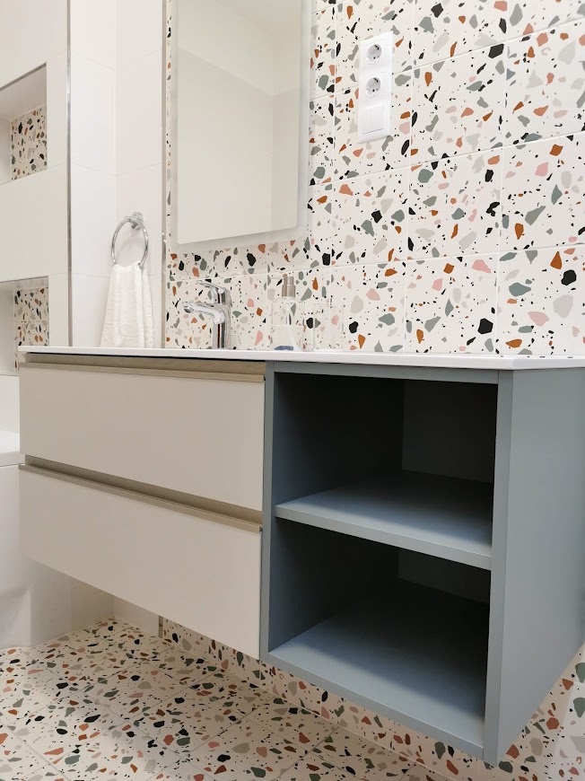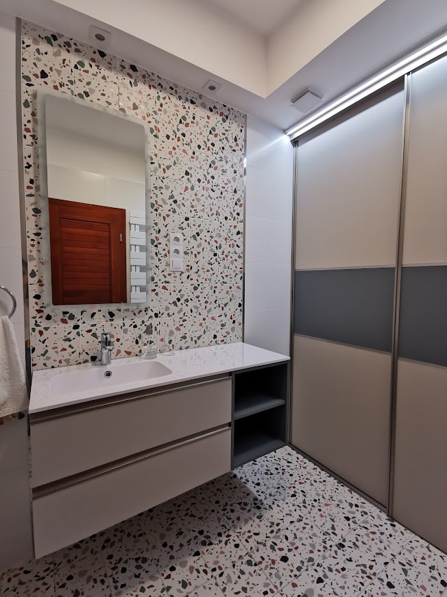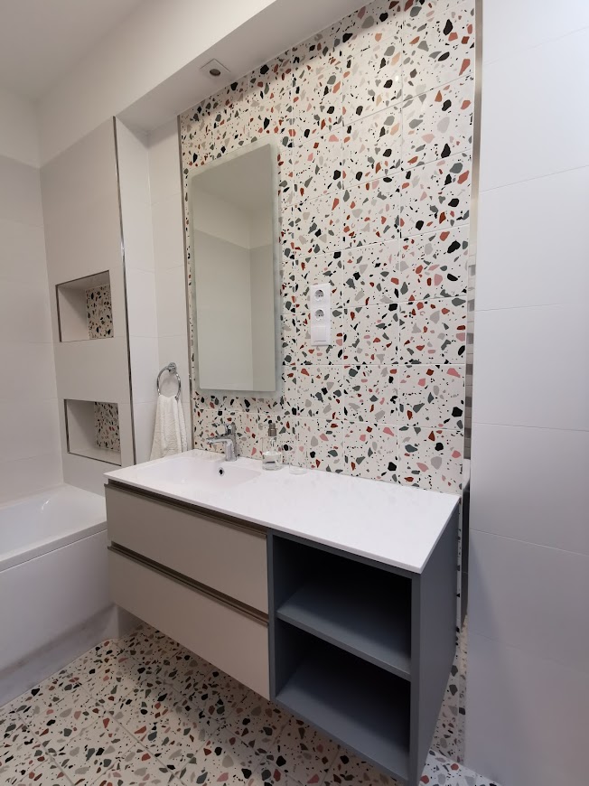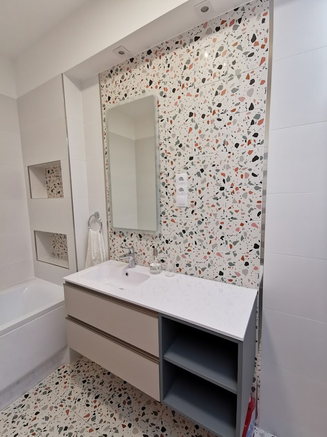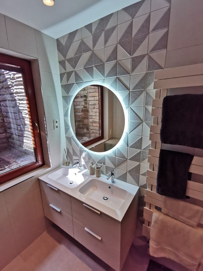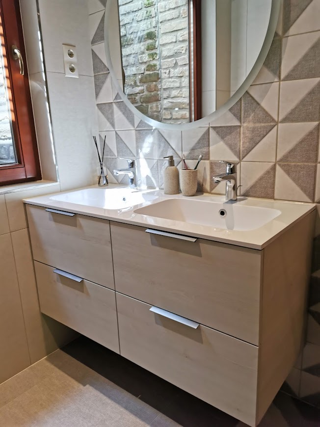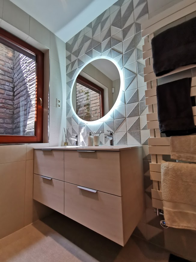 A fürdőszobákban a lebegő, letisztult bútorok és a dupla mosdós megoldások kaptak főszerepet, melyek remekül ellensúlyozzák a karakteres, geometrikus burkolatokat. Az egész lakásra jellemző egységes anyaghasználat és precíz illesztések teremtenek valódi összhangot a terek között.