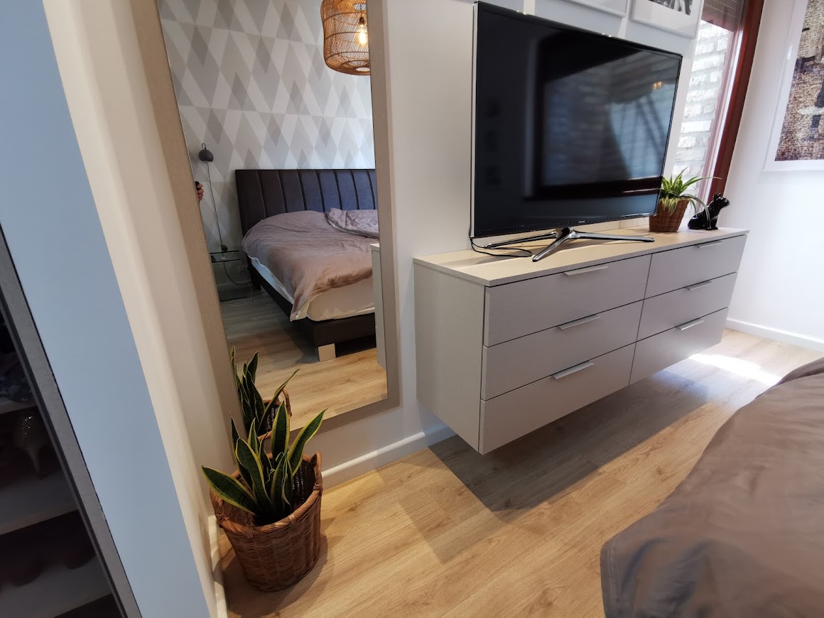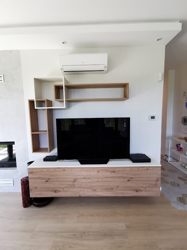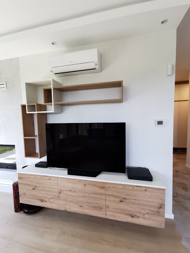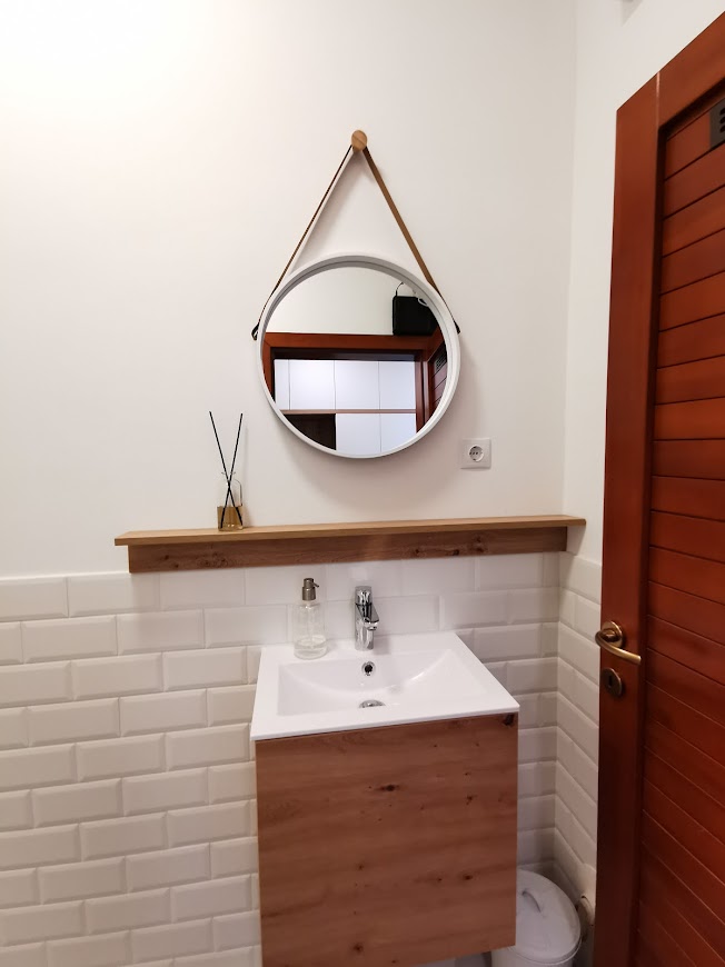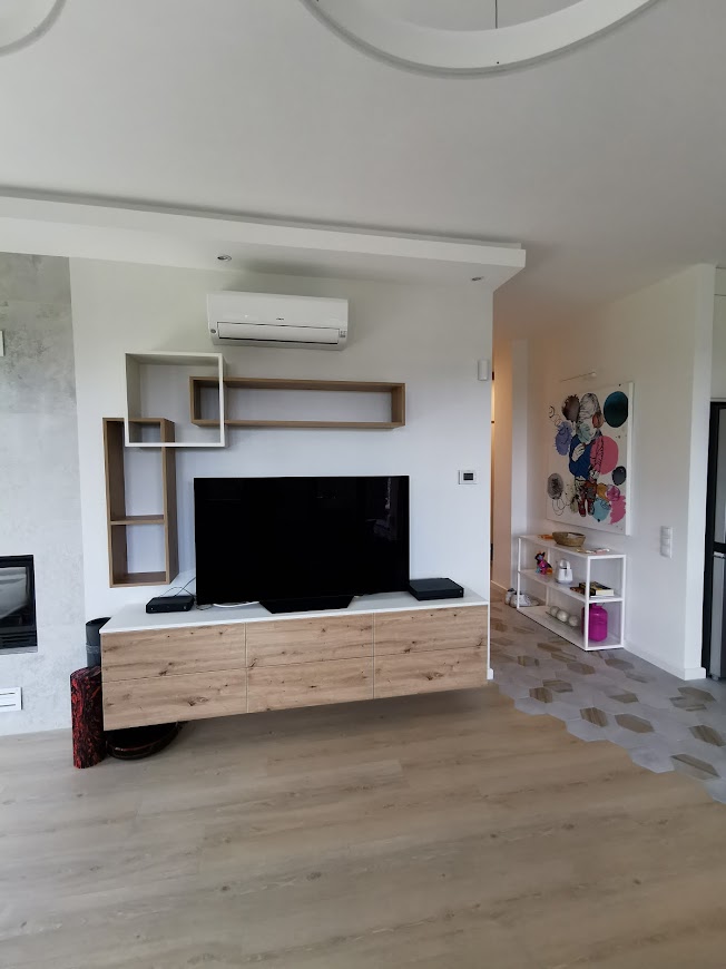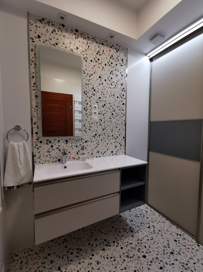 A fürdőszobákban a lebegő, letisztult bútorok és a dupla mosdós megoldások kaptak főszerepet, melyek remekül ellensúlyozzák a karakteres, geometrikus burkolatokat. Az egész lakásra jellemző egységes anyaghasználat és precíz illesztések teremtenek valódi összhangot a terek között.