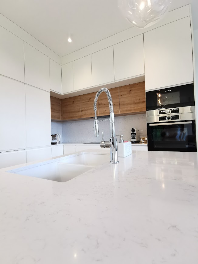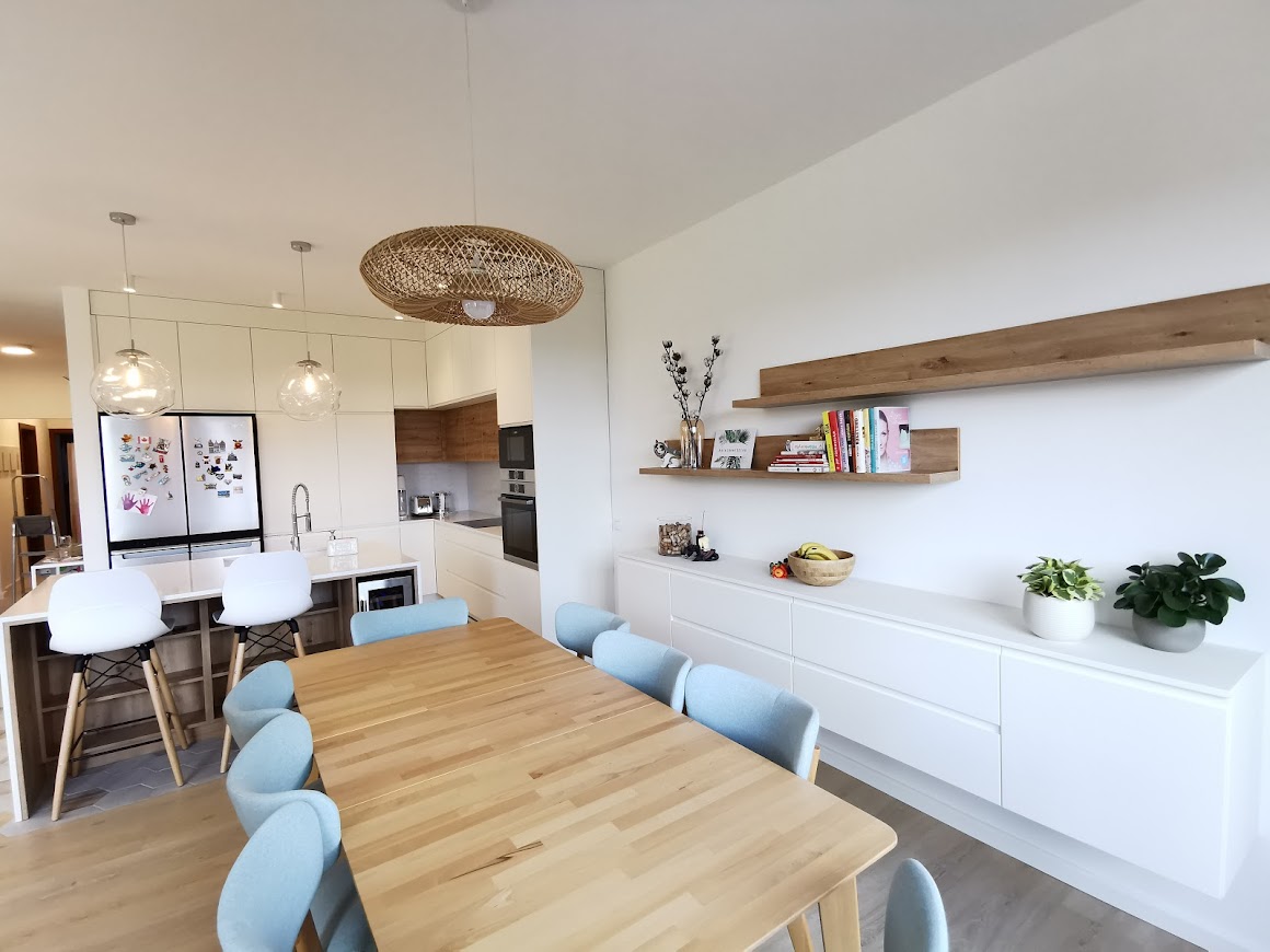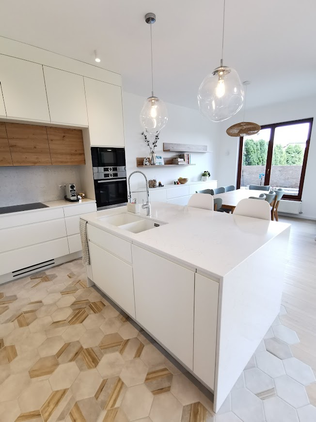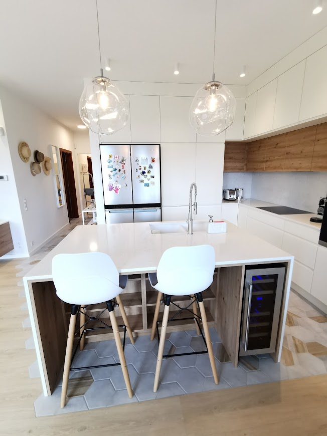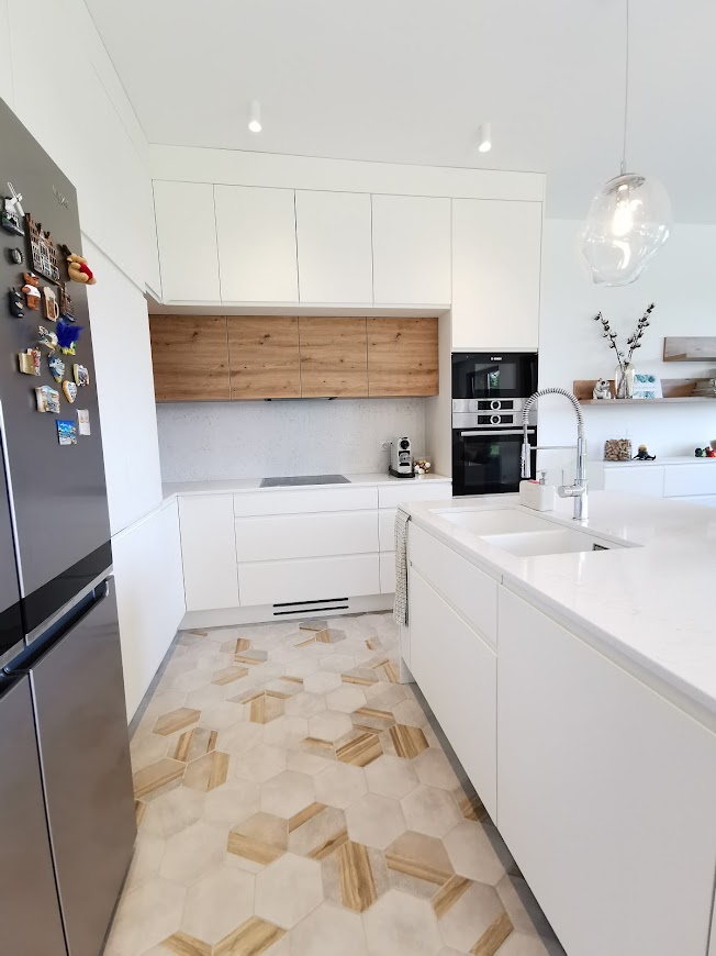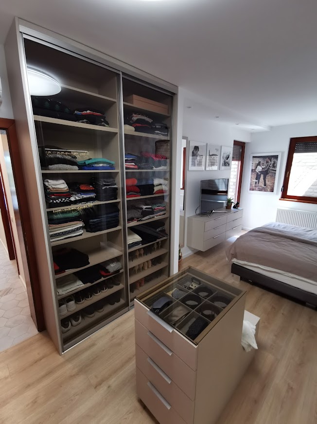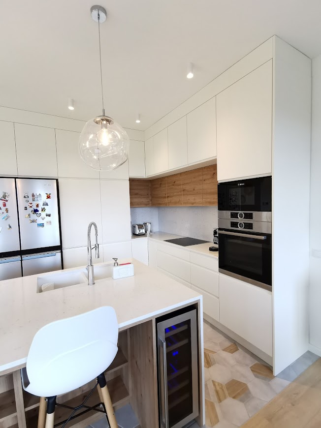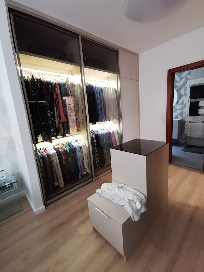 A belső terek egységes stílusa és az átgondolt tervezés határozza meg ezt a modern otthont. A konyhában a mennyezetig futó fehér frontok és a fa textúrák találkozása maximalizálja a tárolást, miközben modern nyugalmat áraszt. A hálószoba ékköve a belső világítással szerelt üveggardrób és a hozzá tartozó ékszerfiókos sziget, ami stílusossá teszi a rendszerezést.