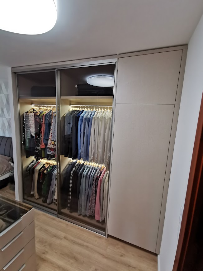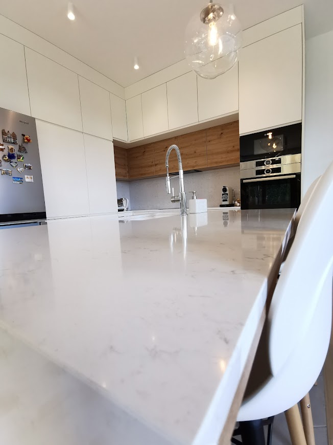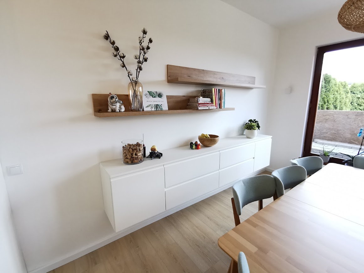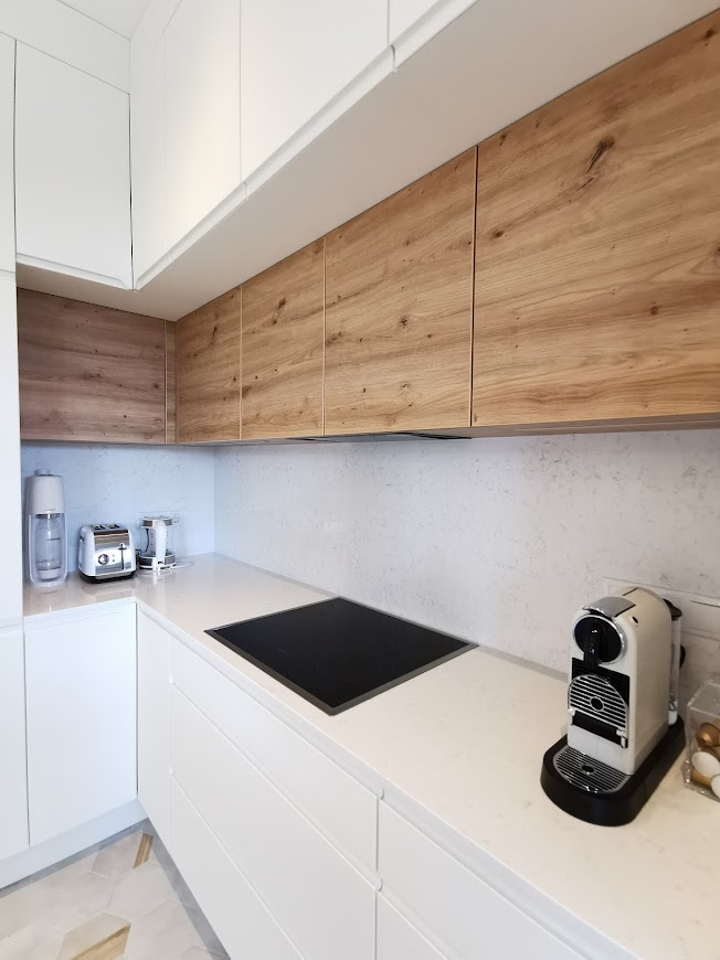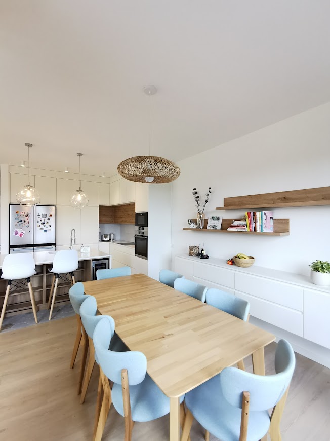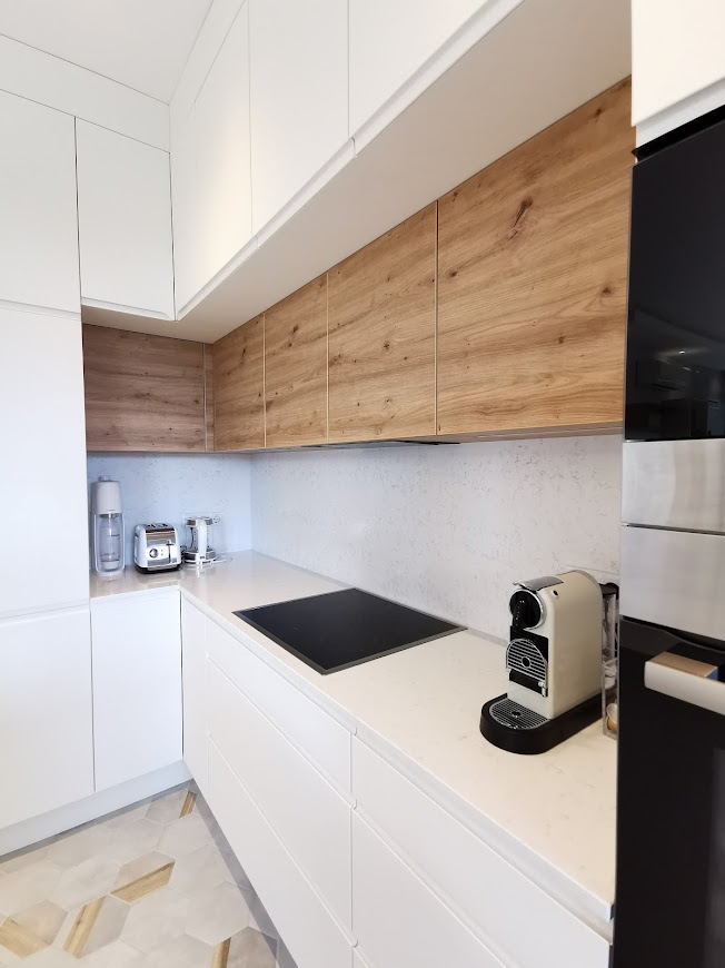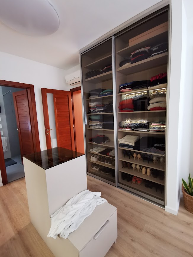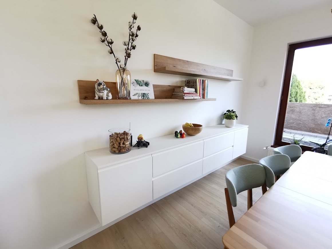 A belső terek egységes stílusa és az átgondolt tervezés határozza meg ezt a modern otthont. A konyhában a mennyezetig futó fehér frontok és a fa textúrák találkozása maximalizálja a tárolást, miközben modern nyugalmat áraszt. A hálószoba ékköve a belső világítással szerelt üveggardrób és a hozzá tartozó ékszerfiókos sziget, ami stílusossá teszi a rendszerezést.