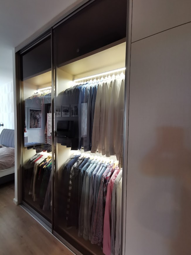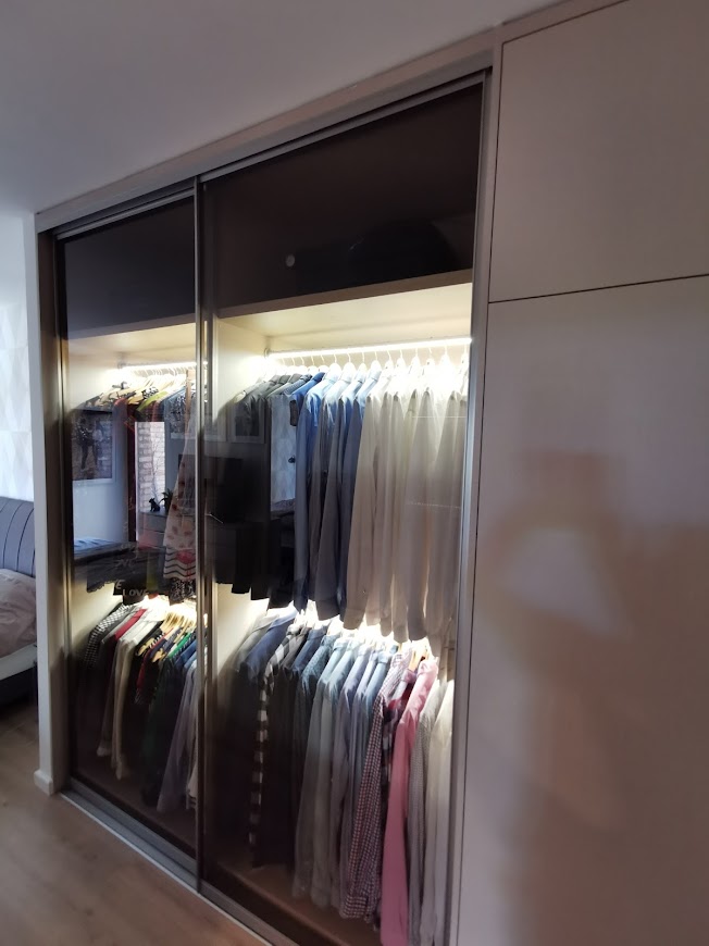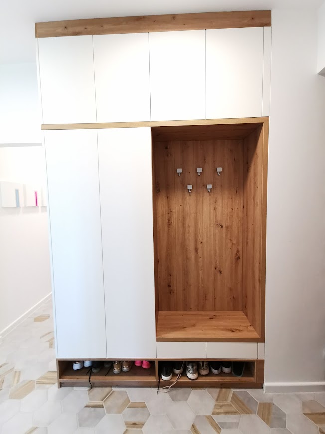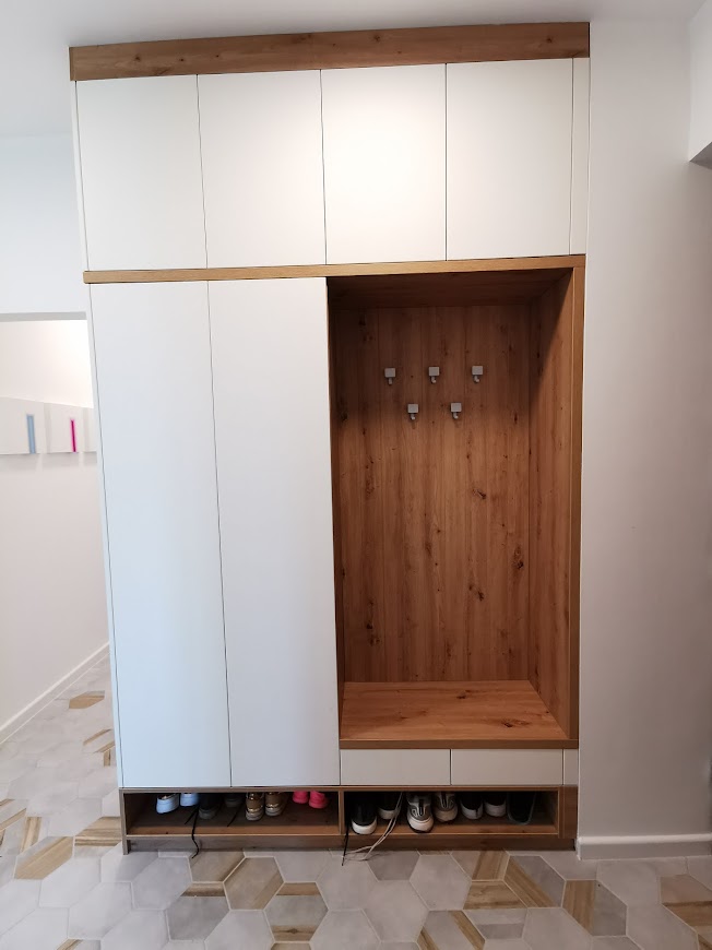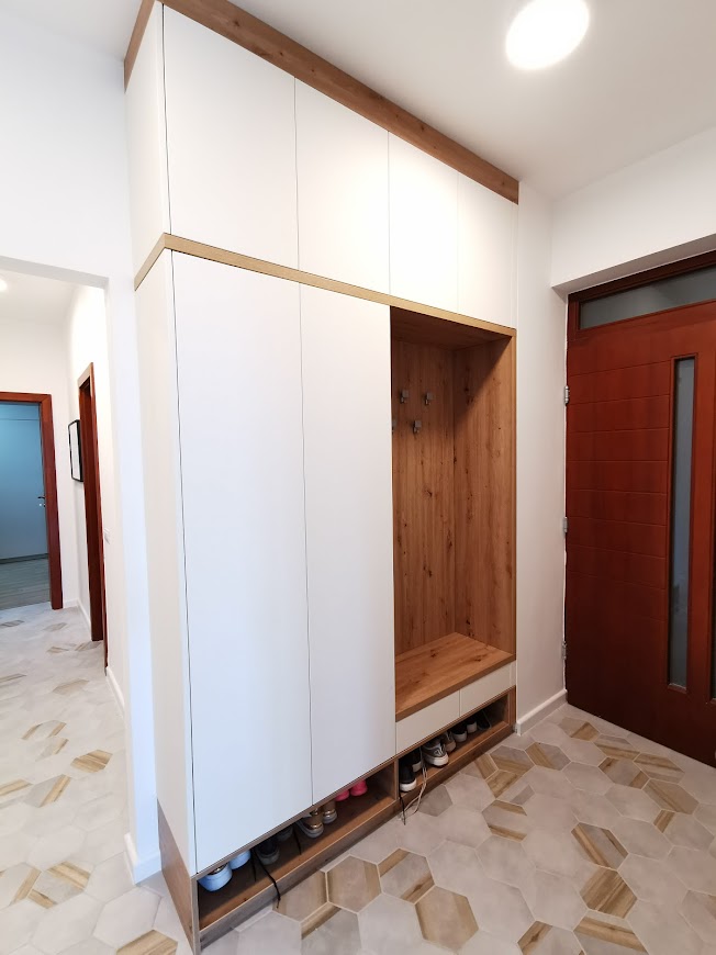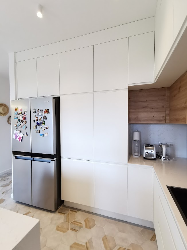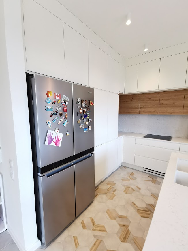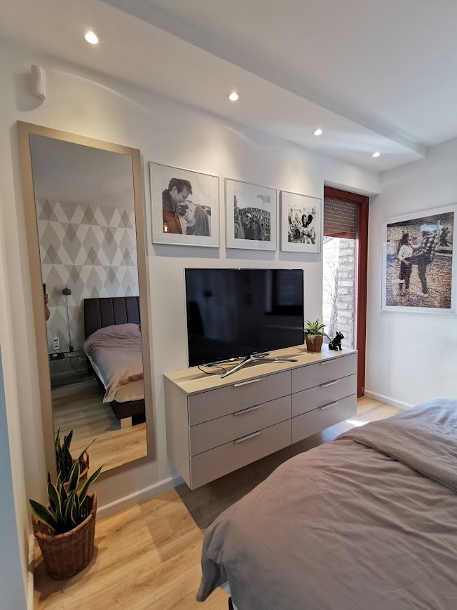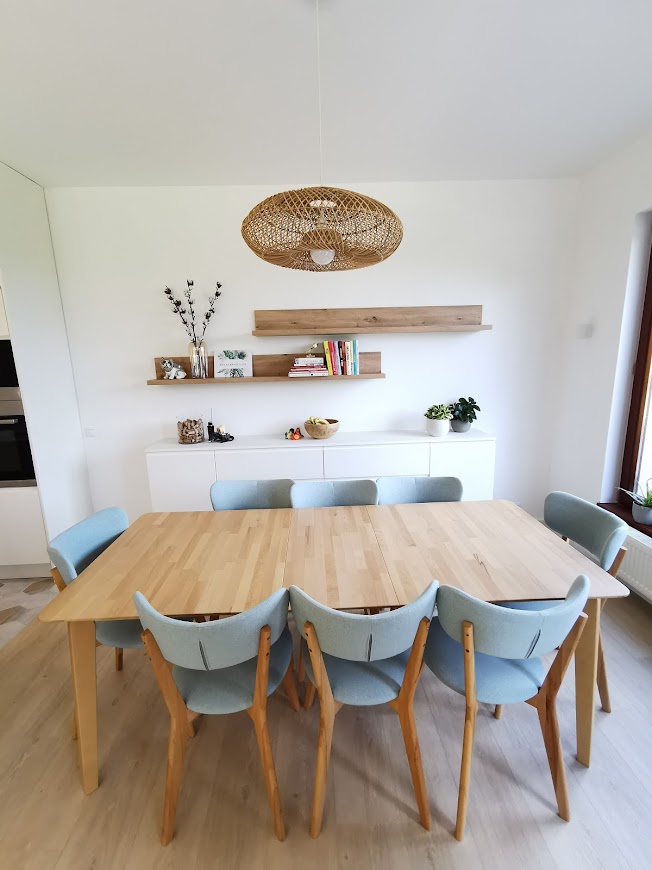 A belső terek egységes stílusa és az átgondolt tervezés határozza meg ezt a modern otthont. A konyhában a mennyezetig futó fehér frontok és a fa textúrák találkozása maximalizálja a tárolást, miközben modern nyugalmat áraszt. A hálószoba ékköve a belső világítással szerelt üveggardrób és a hozzá tartozó ékszerfiókos sziget, ami stílusossá teszi a rendszerezést.