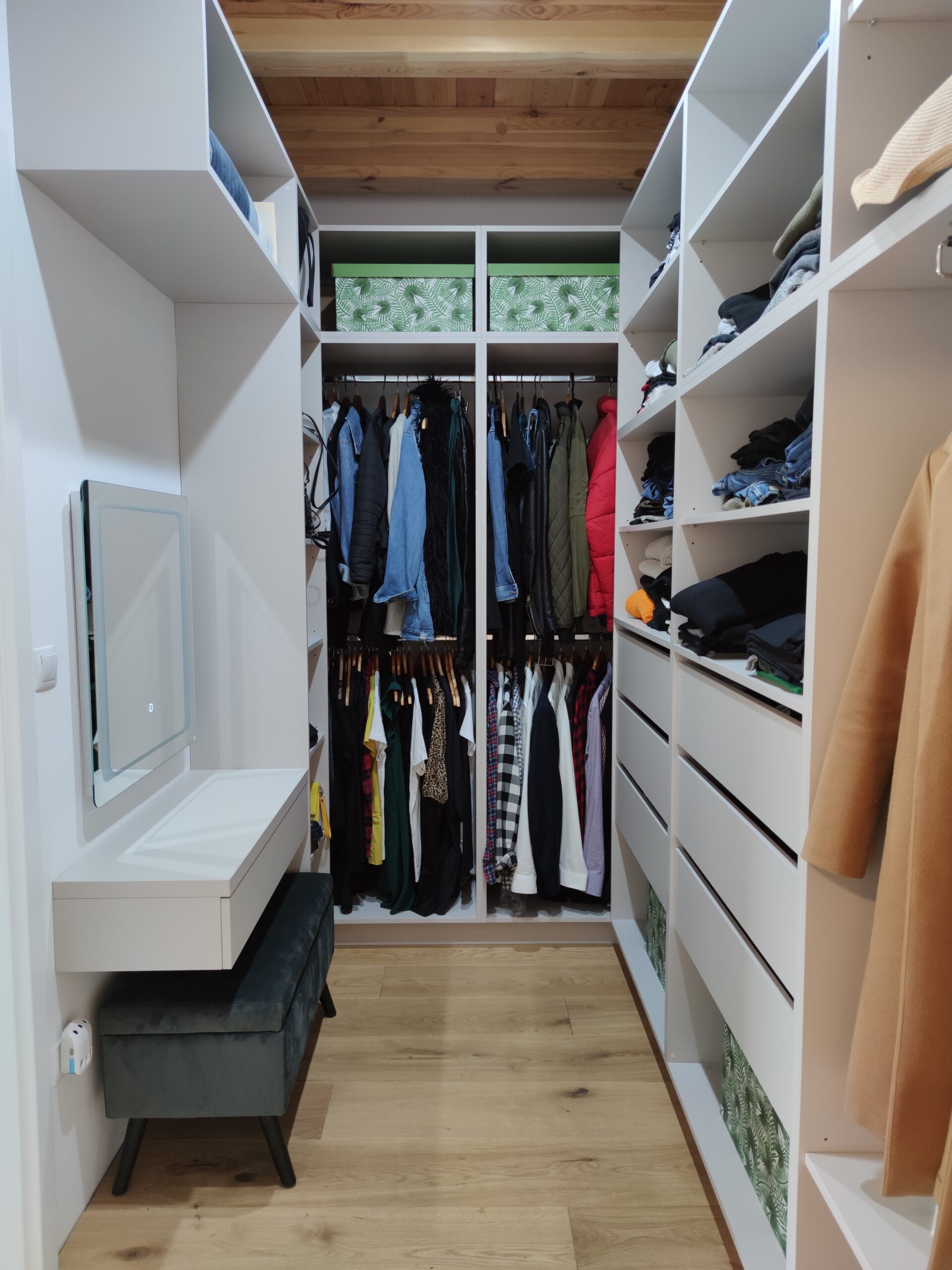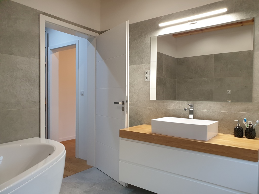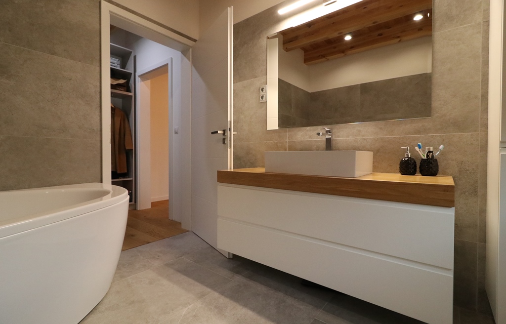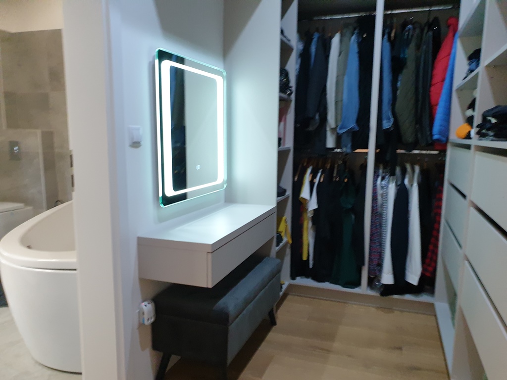 A hálószobában egyedi, mennyezetig érő nyitott gardróbrendszert és beépített fésülködőasztalt alakítottunk ki LED-tükörrel. A fürdőszobai lebegő mosdópult a fa melegségével teszi teljessé az összhatást. Precíz kivitelezés, ahol minden milliméter számít.